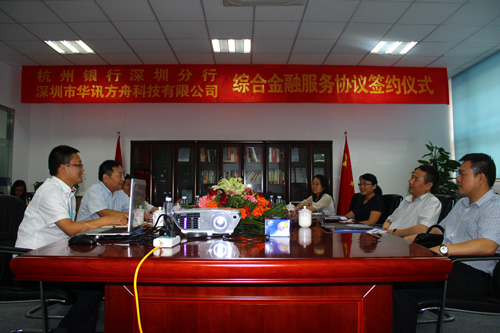7月25日,杭州銀行深圳分行與華訊方舟的綜合金融服務協(xié)議簽約儀式在集團總部舉行,杭州銀行深圳分行行長冷文廣及其代表,華訊方舟總裁黃永江、副總裁Sunny等領導共同出席了簽