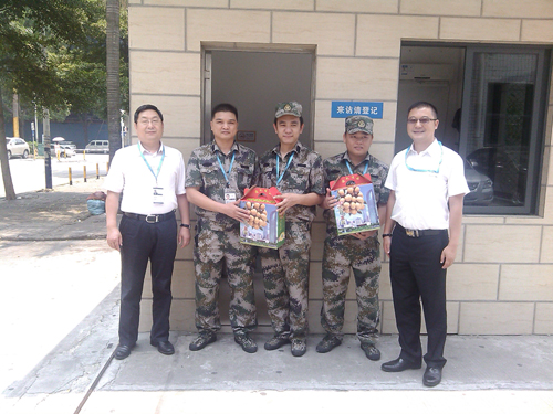 8月1日,正逢建軍節,集團副董事長兼總裁吳光勝、首席科學家黃永江來到公司門崗,看望慰問在崗的保安人員,并送上節日禮品?!  强倧娬{“華訊方舟的保安就是華訊方舟